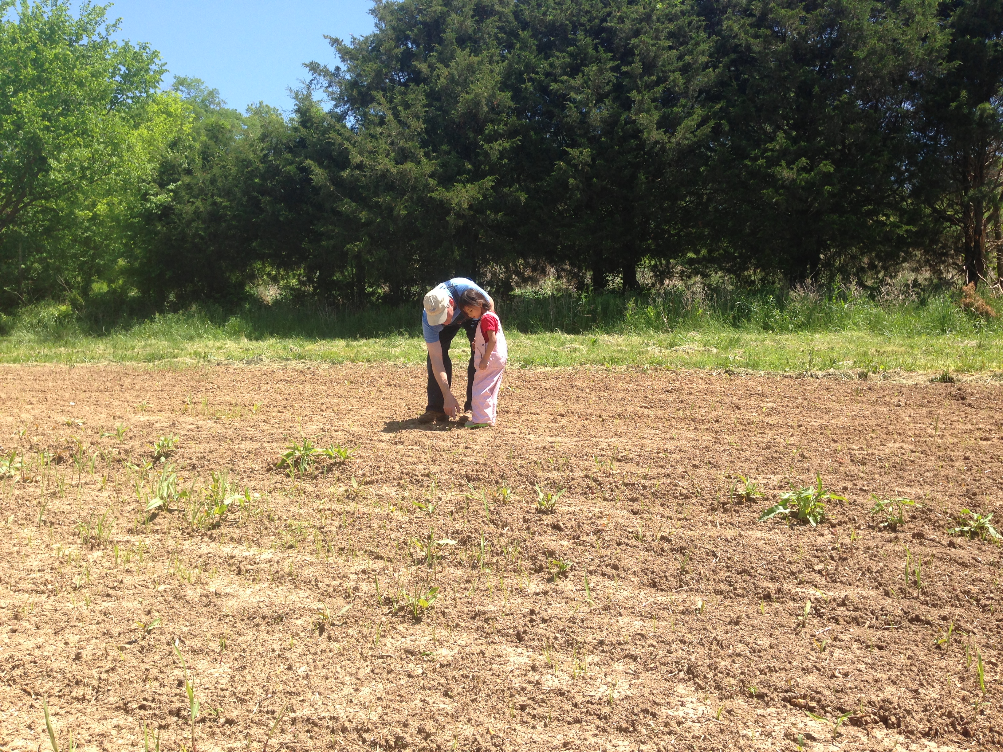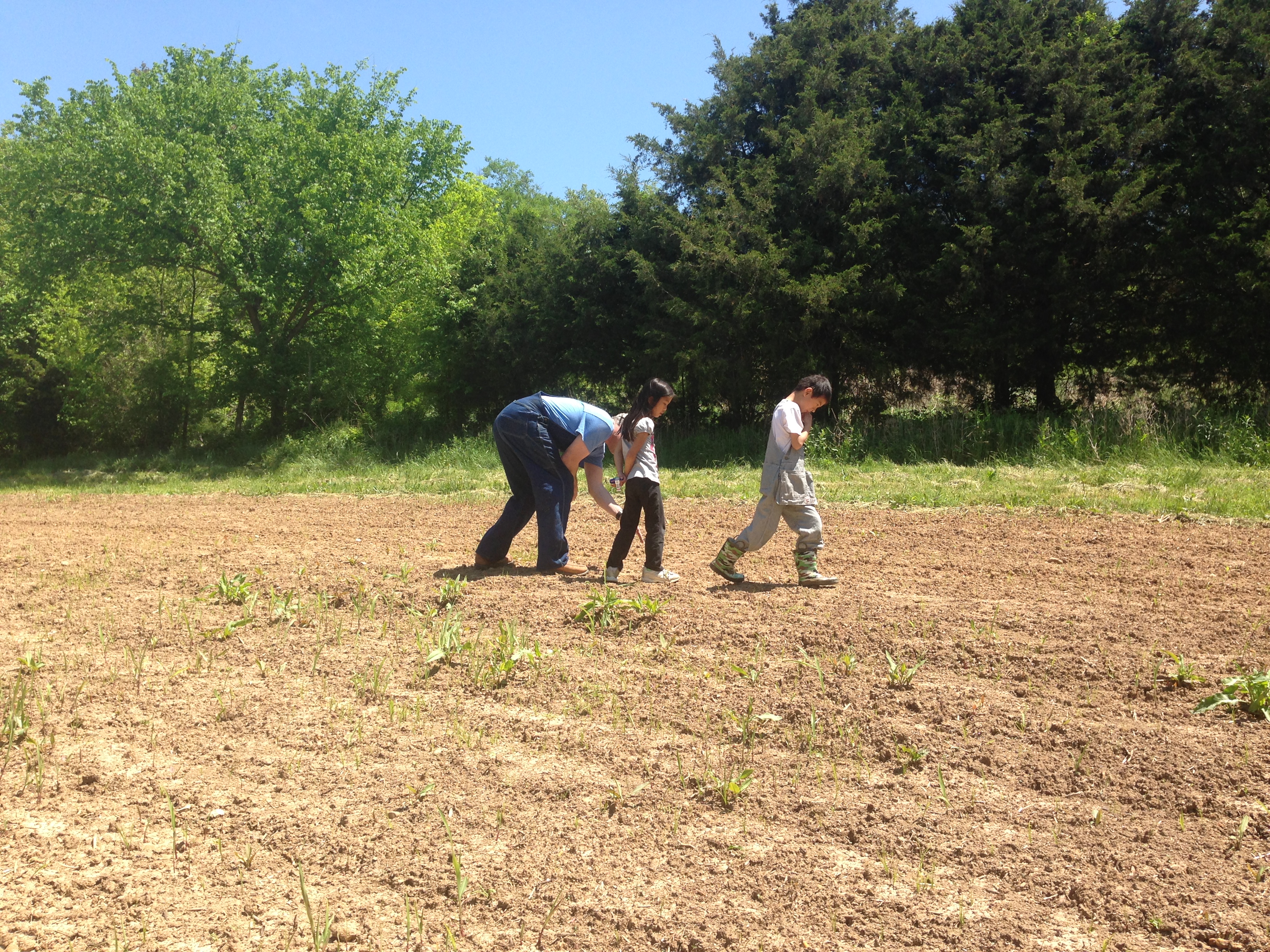 In addition to these three large garden plots in our backyard, we have an even larger plot up on the hill behind the barn. A couple of weeks ago the Prez and some of our children planted 5 rows of corn up there. The Prez says it is coming up, but I can’t see it. Here he is showing some of our helpers the sprouts.