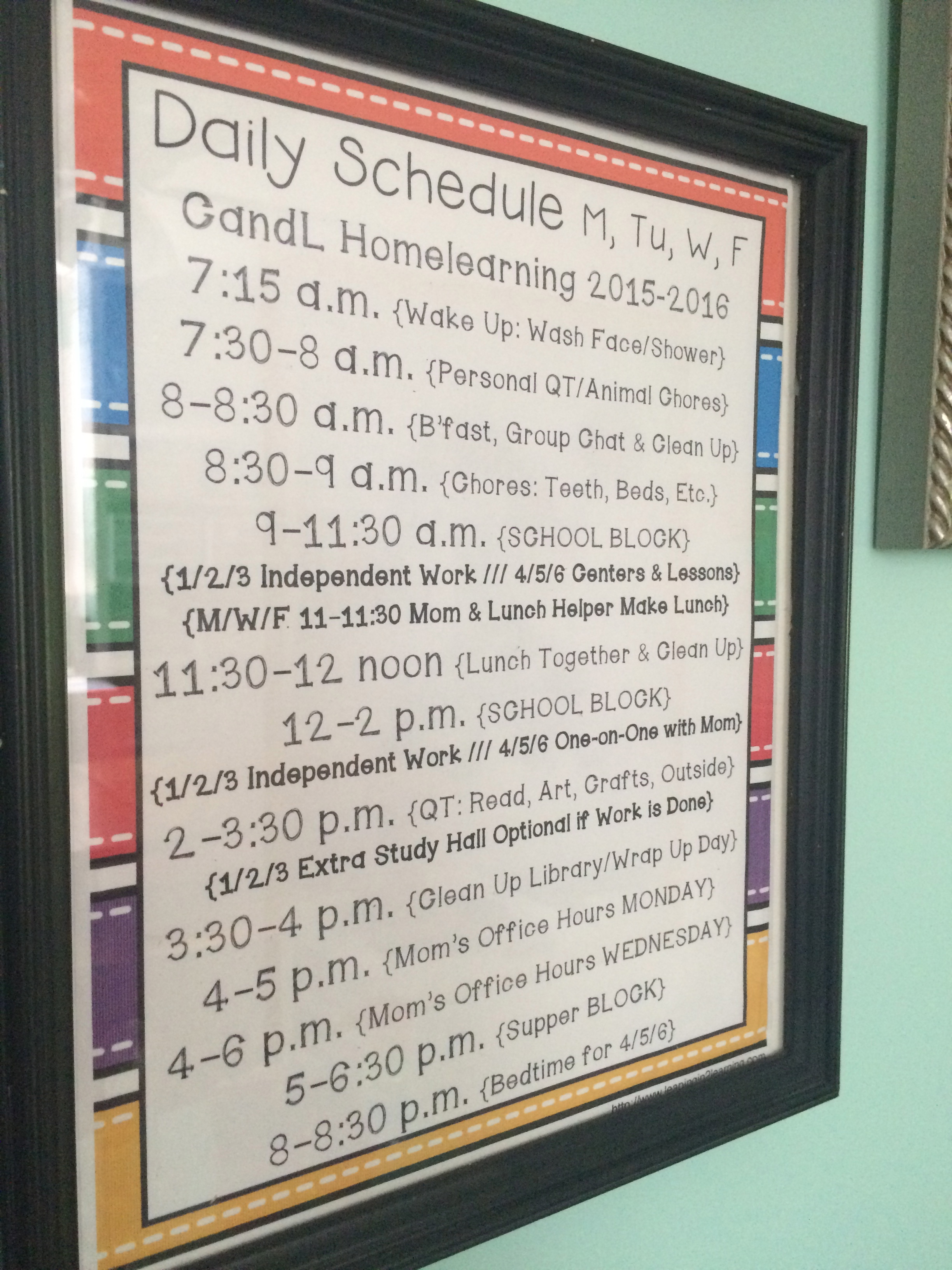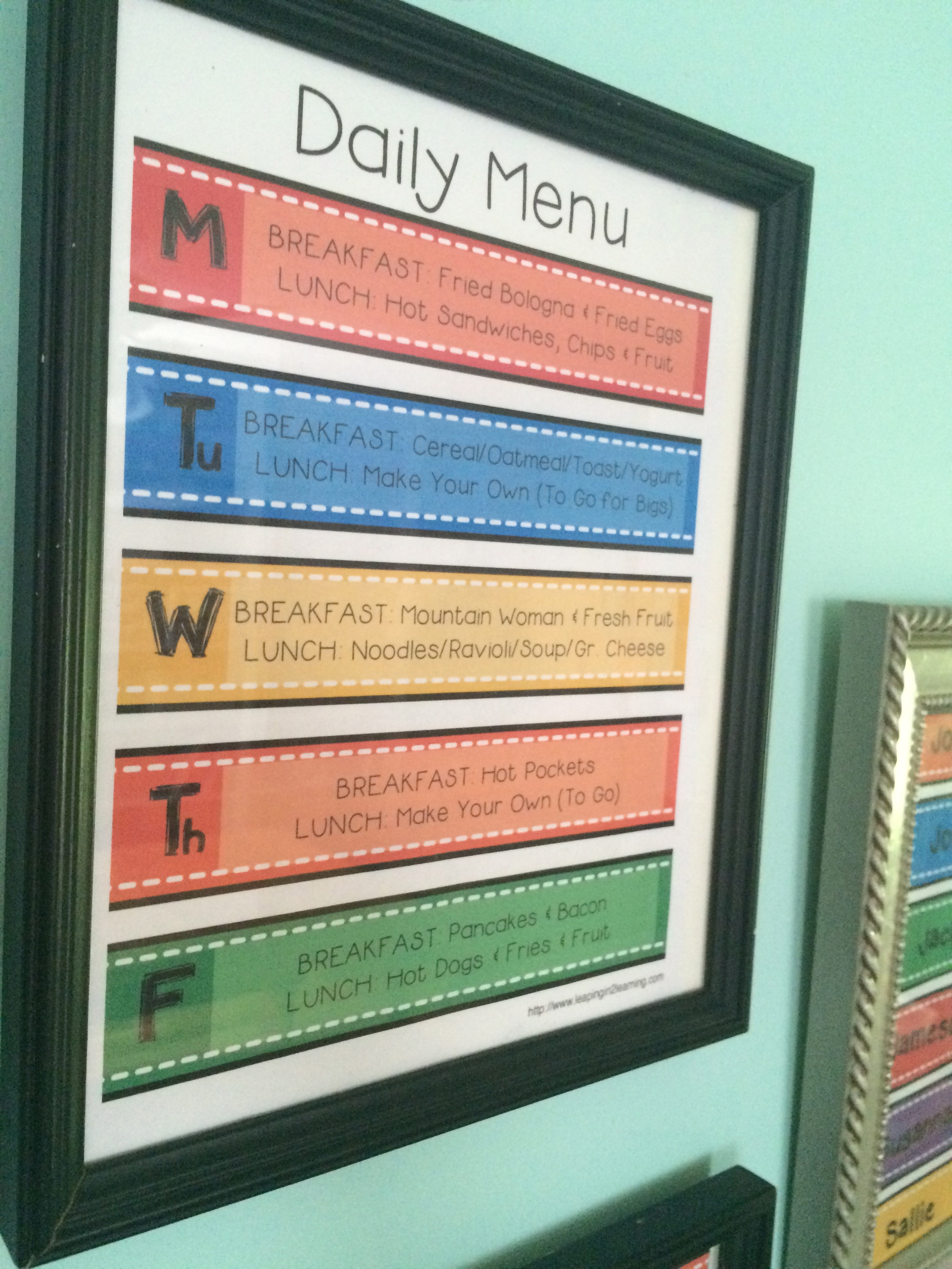 About that daily menu, a). it helps tremendously with the grocery budget and b). it helps tremendously with the smoothness of our days together. Each child as you might imagine helped to choose foods they like in particular so no one is unhappy with the choices on more than a day or two, but so far there aren’t any complaints and breakfast and lunch are running quite smoothly and efficiently! We also usually enjoy the time together to have meaningful discussions and/or sometimes be a little silly too!