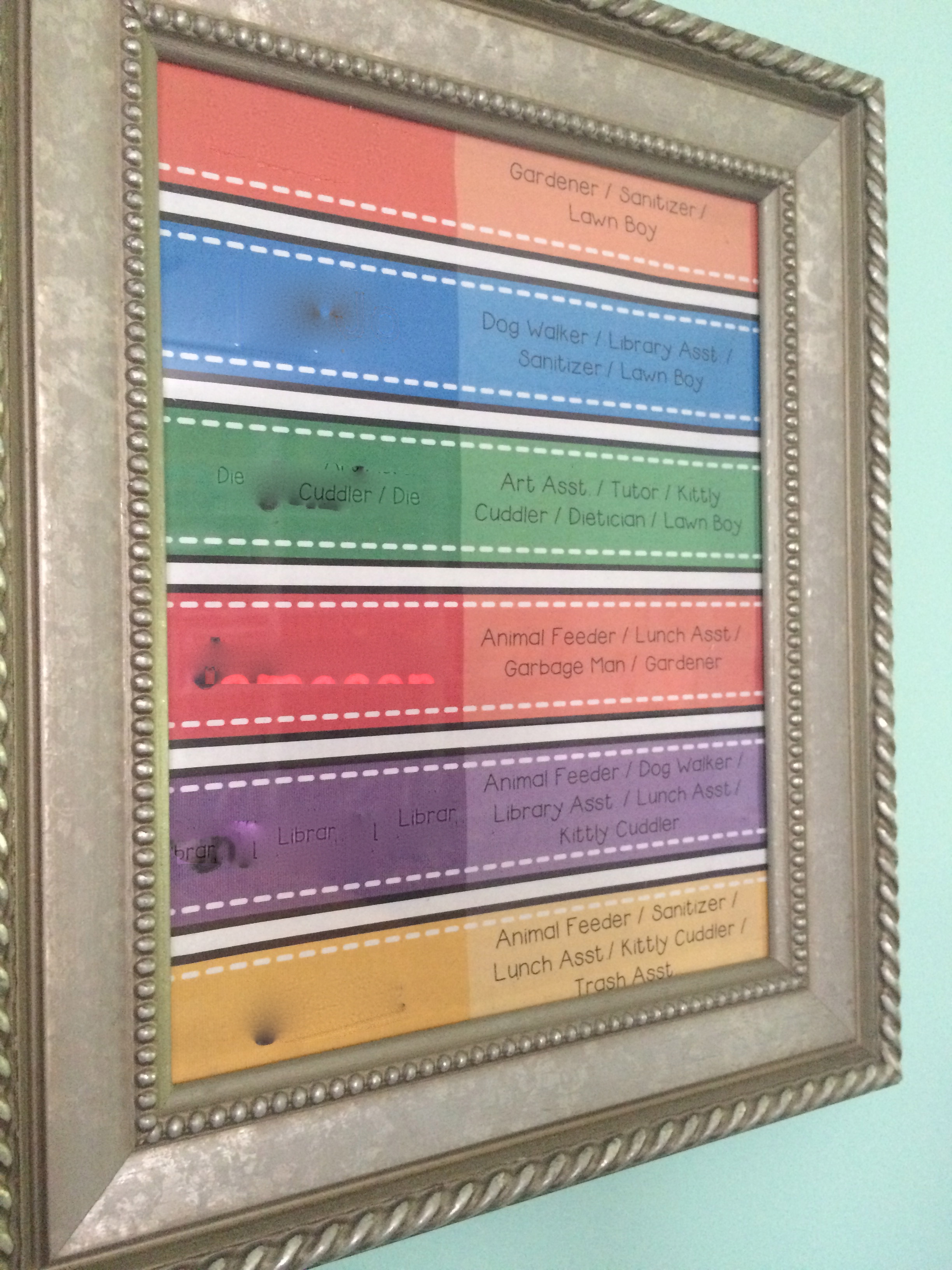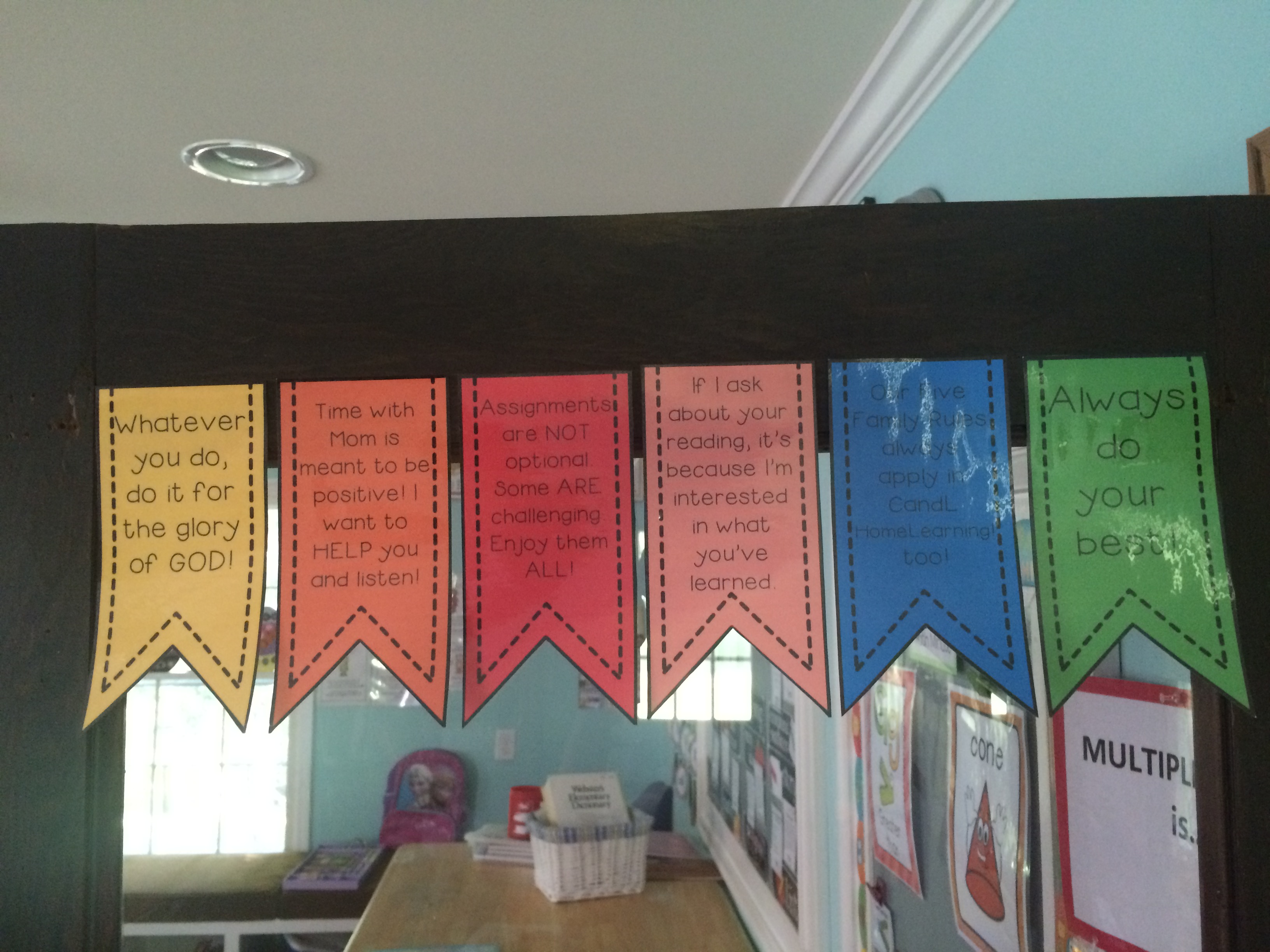 In addition to the posted daily schedule, I posted a volunteer jobs list. On the second day of school (our first was Thursday tutorial day so no time), we sat down together and went over rules, expectations, menus (more on that) and I mentioned a new idea: classroom volunteers. To my delight, the children jumped on this and quickly took on various volunteer jobs from dog walker to tutor to lunchtime helper. Having these tasks assigned really helps with our efficiency and helps us function as Team “Last Name” should.