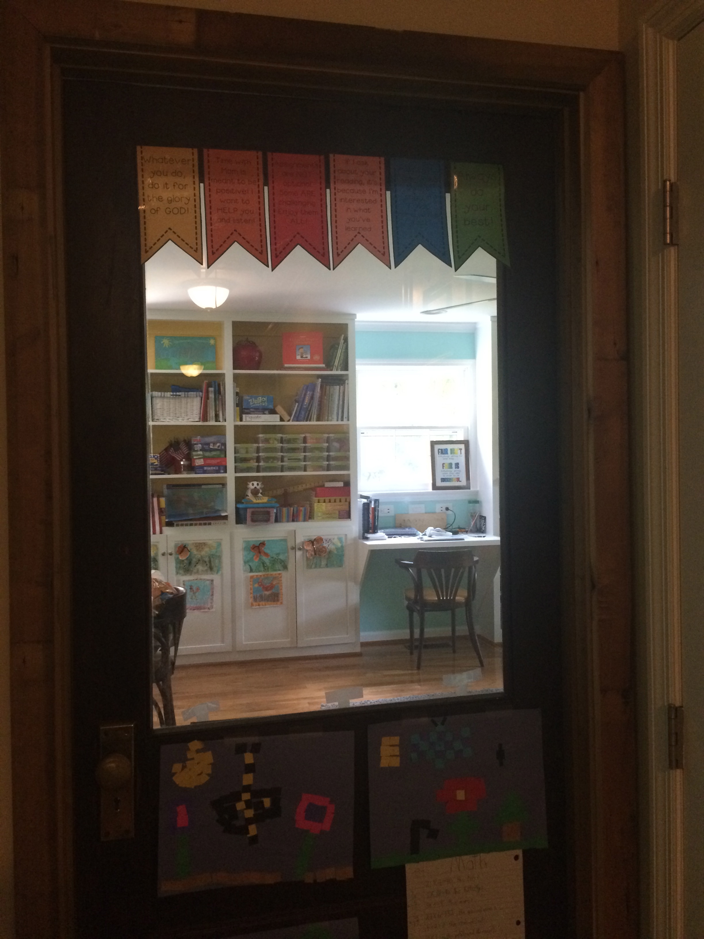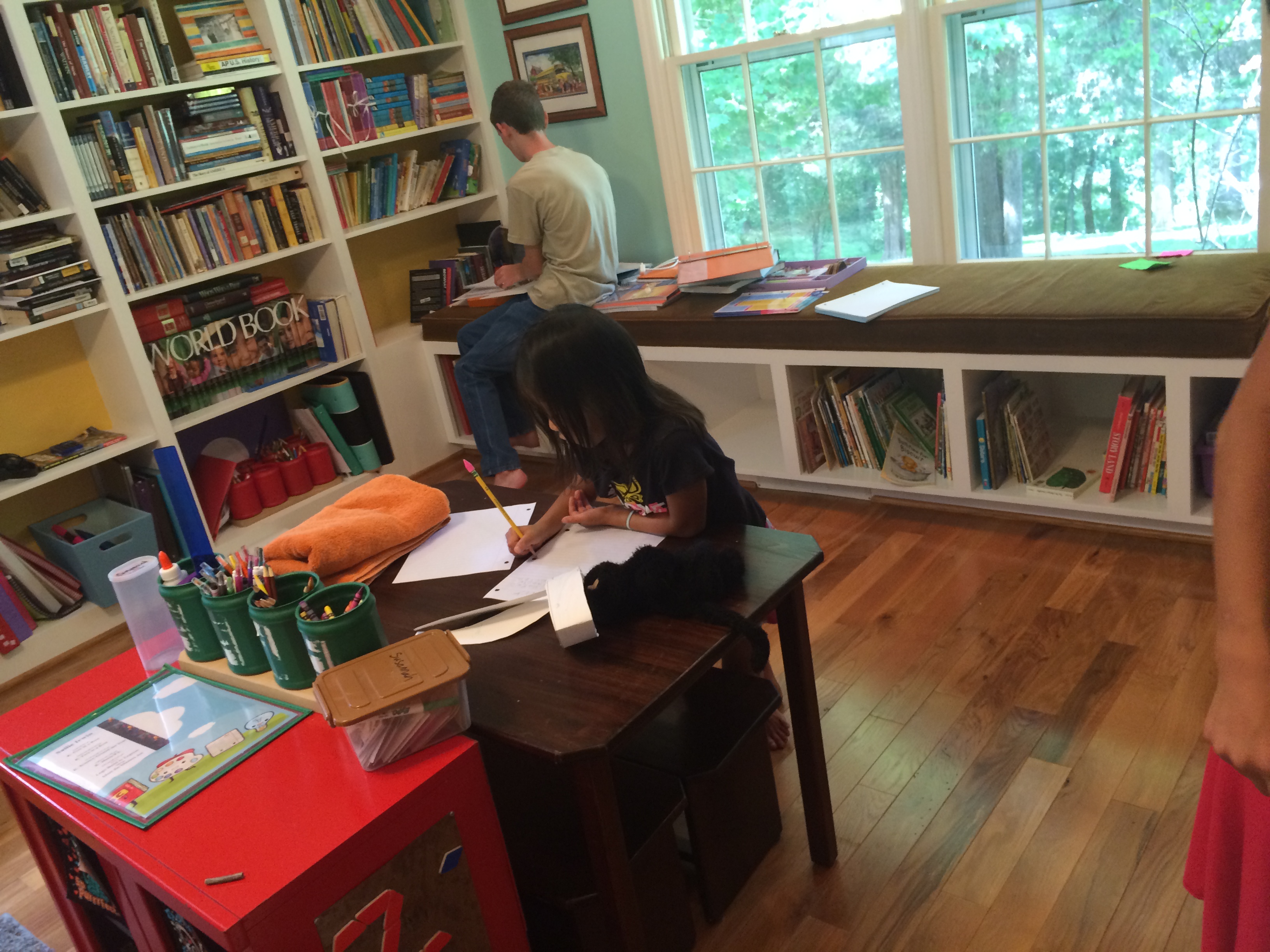 I have designated workspaces for my youngest 5 learners, but they also can move about the room as well, and it isn’t uncommon for some of us to take books to the back porch or to do reading together on the couch in the den. Some things need to be done at a table and/or desk area, but many things lend themselves to various locations. We’ve been known to throw a quilt on the ground too! The photos below show various students at their designated work spaces.