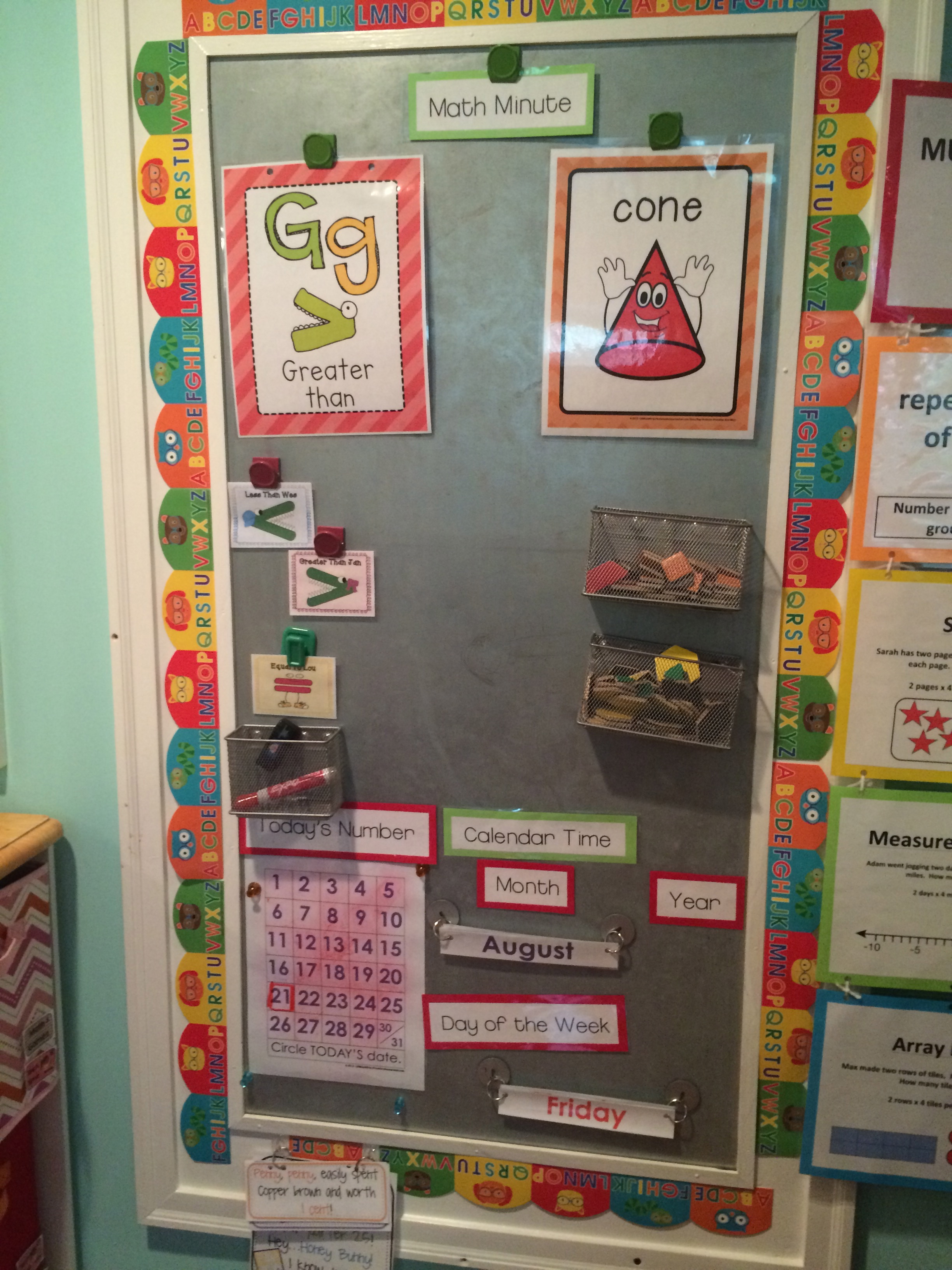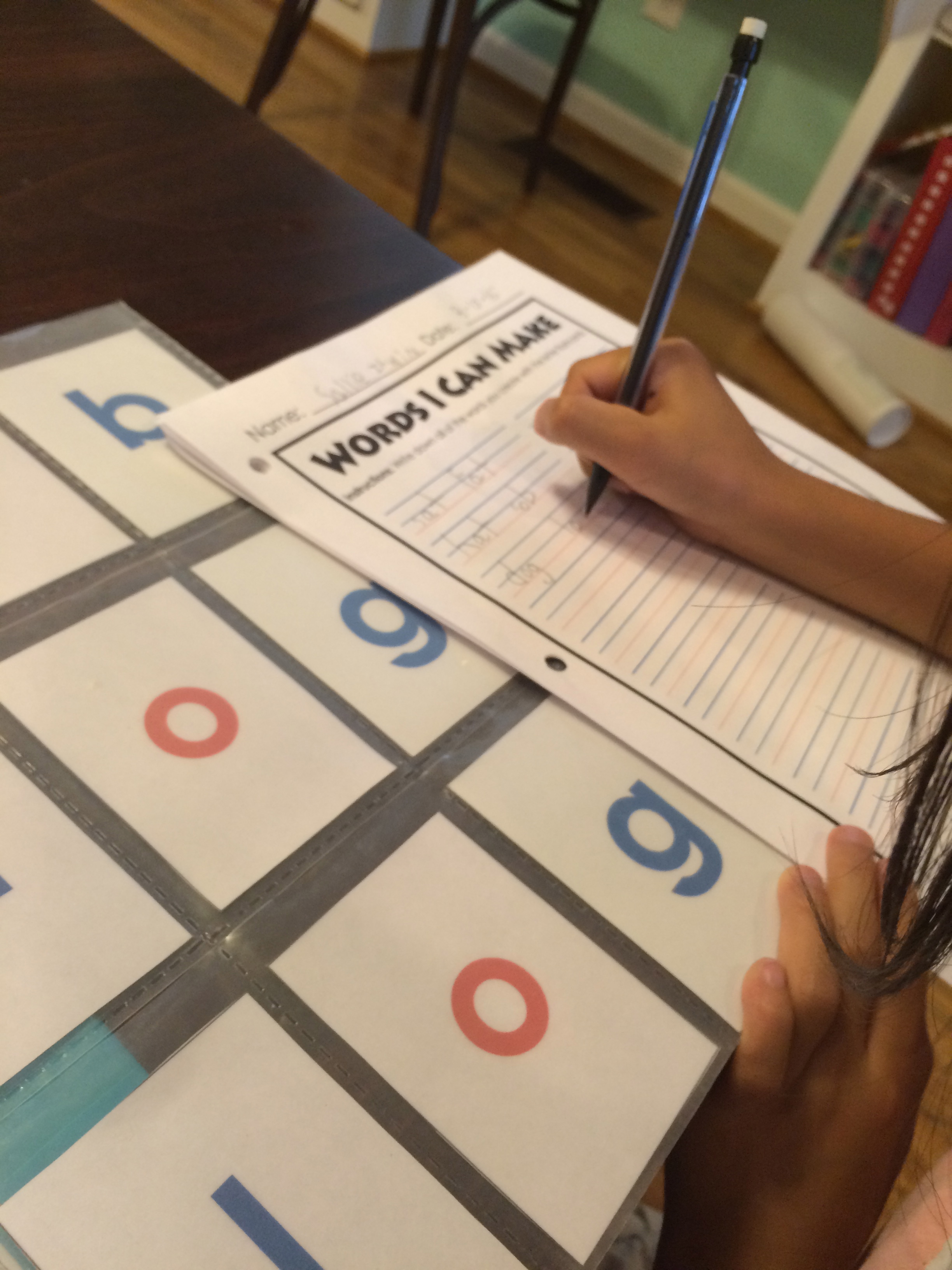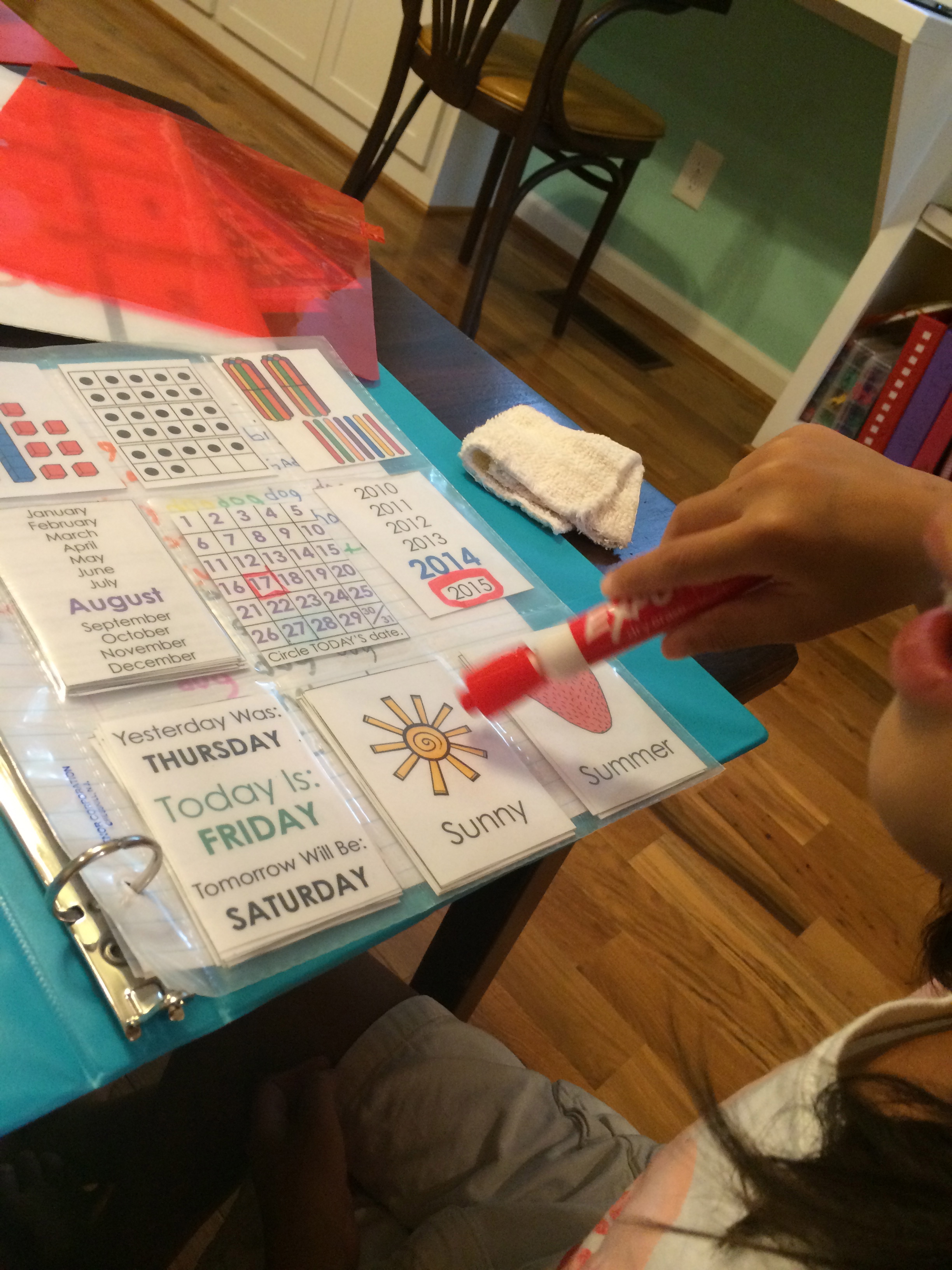 This magnetic board houses our large calendar, which coordinates with Li’l Bit’s personal interactive calendar. She is loving using this every morning, and for now any learning that takes place is icing on the cake. She loves to make her daily calendar, form CVC words and 2-digit numbers! This resource is available for purchase at my TpT store if you’re interested!