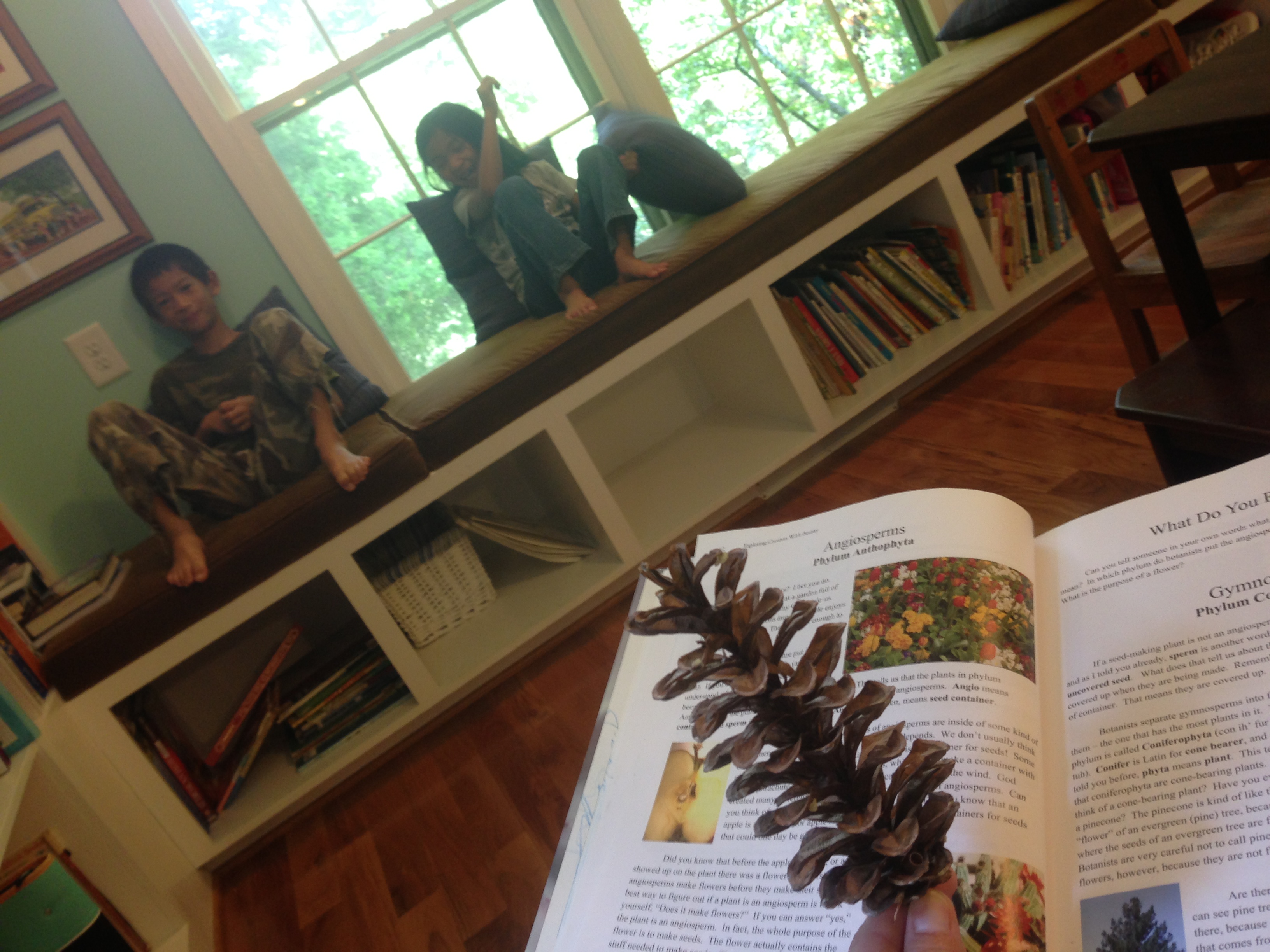 After working on our journaling, we read about different plants have different types of seeds. Some have “containers” like an apple tree has a fruit (the apple) and some don’t have seed containers like the magnolia tree and the pine tree, which have “cones” and are coniferous.