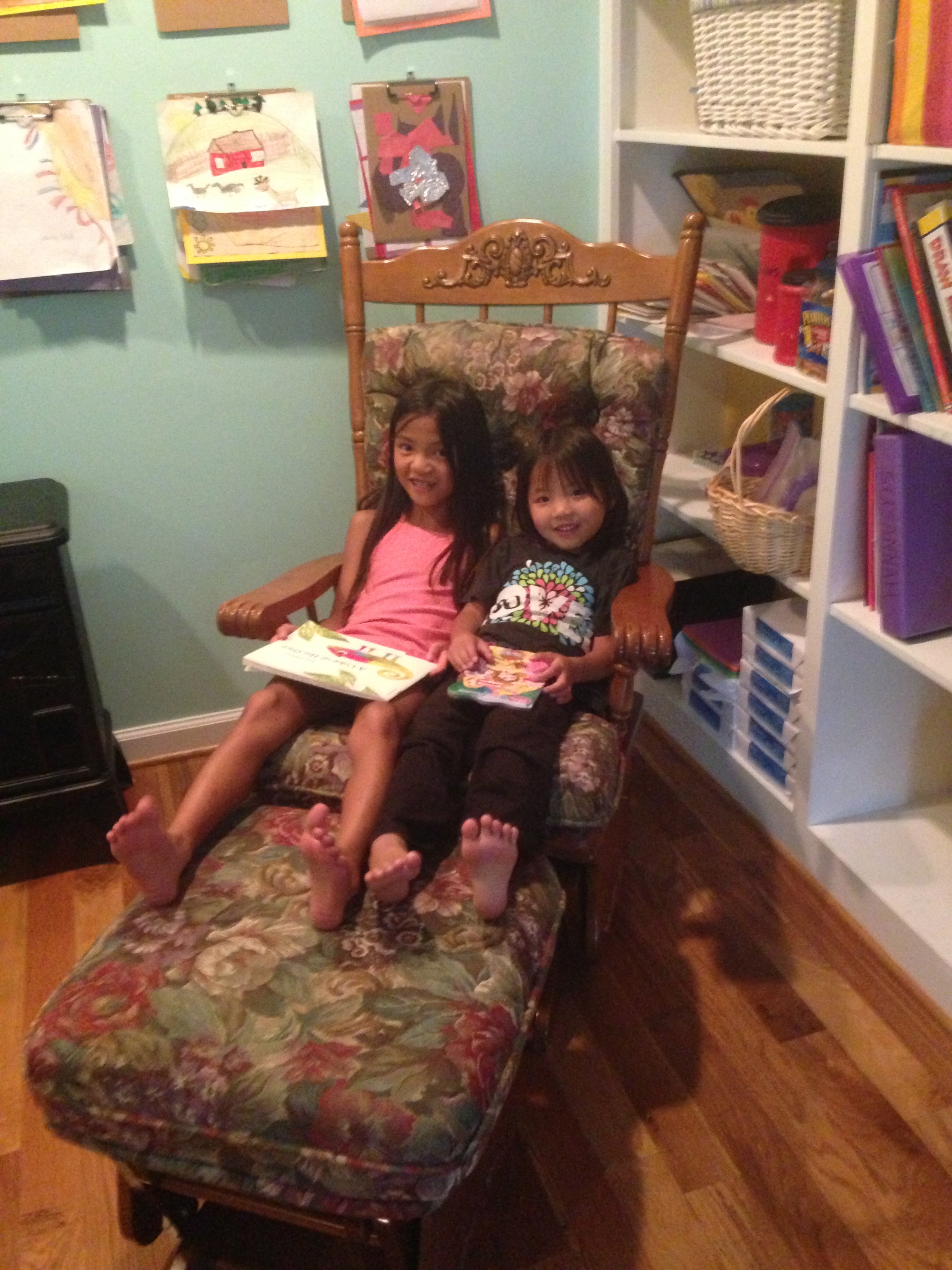 A dear friend gifted us with a used, but like-new glider rocker. I decided to try to find a spot in the library for it, and so far it has been very well received. I admit it has been a great spot to have Li’l Bit curl up in my lap and listen to Momma read!