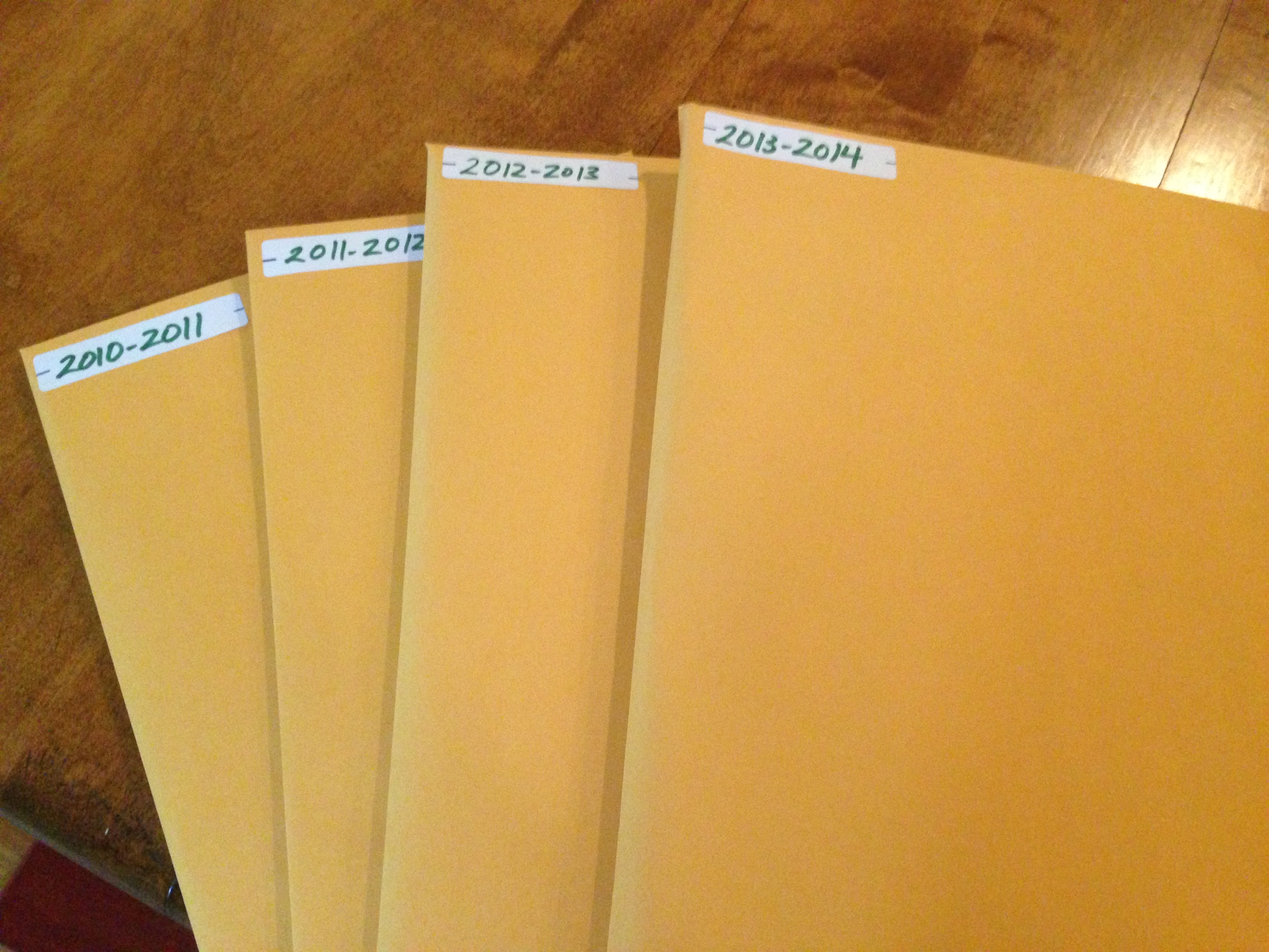 I decided I didn’t need all of this in binders anymore as it is strictly for record at this point, so I put it all in 9×12 envelopes where it takes up a LOT LESS room and is hopefully just what I needed to keep (e.g. I threw a lot of their previous years’ school work out! Nothing important just papers).