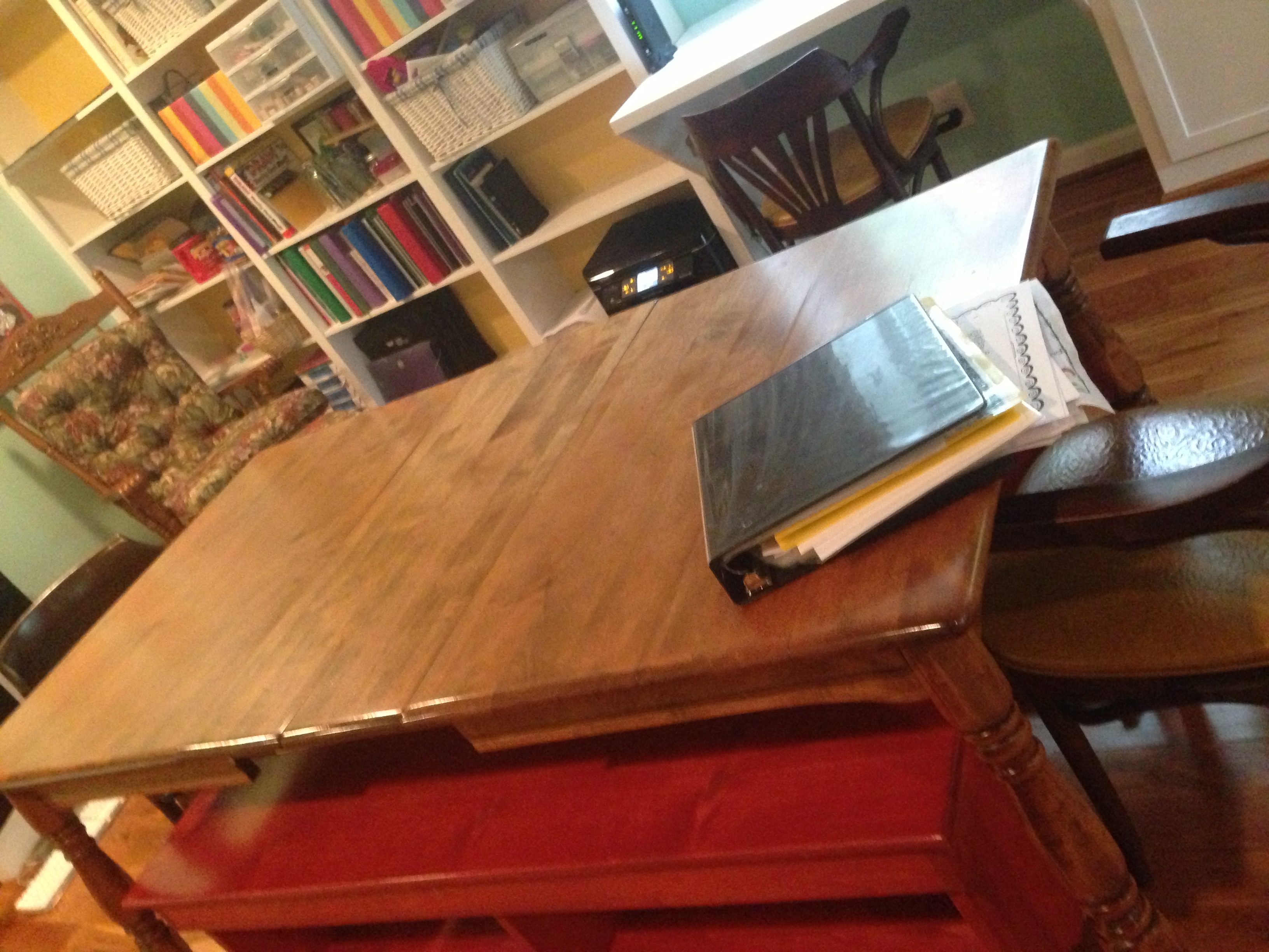 My next big project to tackle was our large table in our library that I had been using to pile stuff onto that I knew I HAD TO GO THROUGH before next week. Piling it on the table was my last-ditch effort to force myself to DEAL WITH IT ALREADY LOL! Here is what the table looked like this morning at 9 a.m.