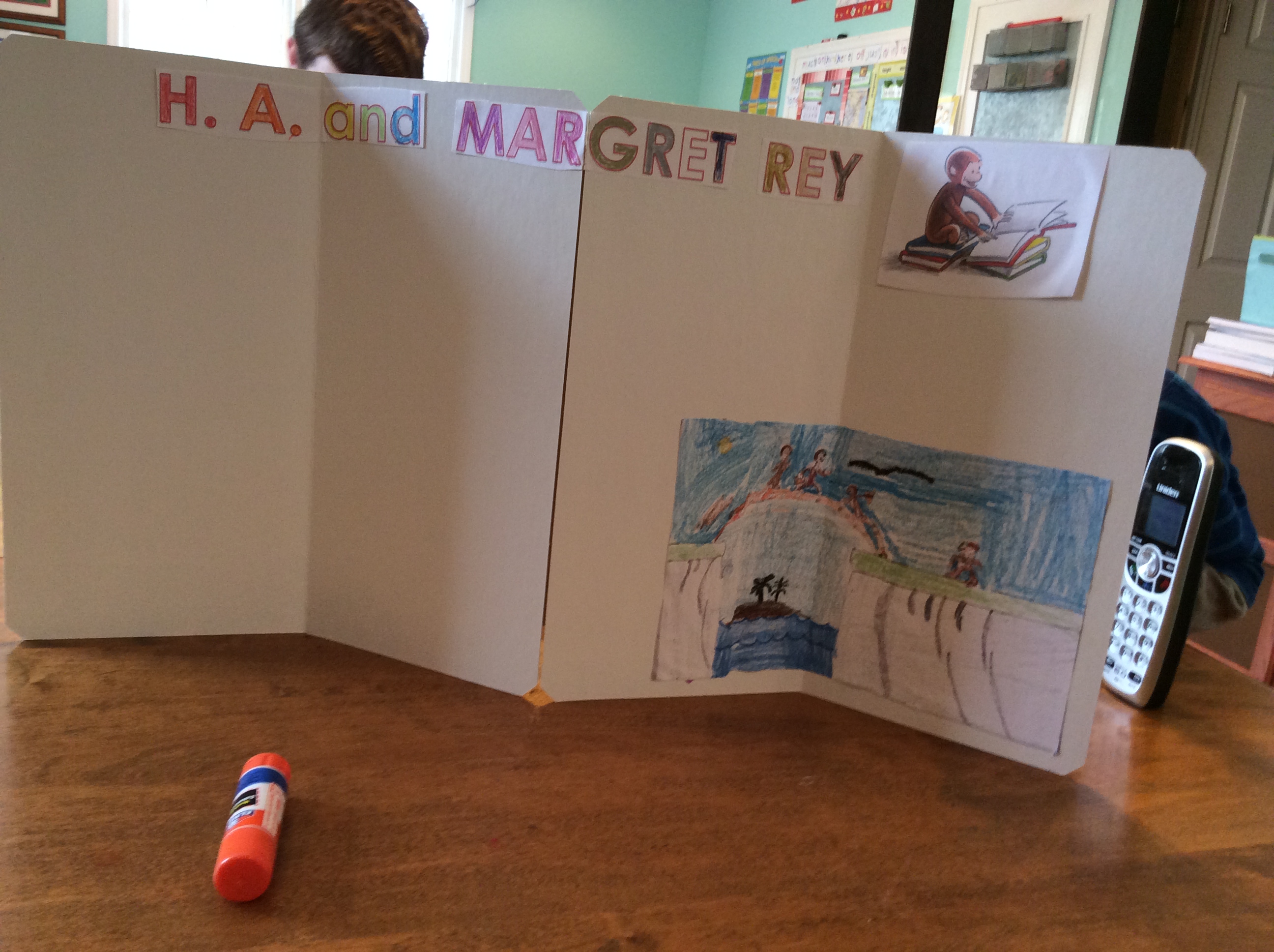 A history project in progress. This board was later finished by Li’l Miss, who is in 2nd grade and studied Jews HA and Margret Rey and their escape from wartime Europe during Hitler’s atrocities against Jews.