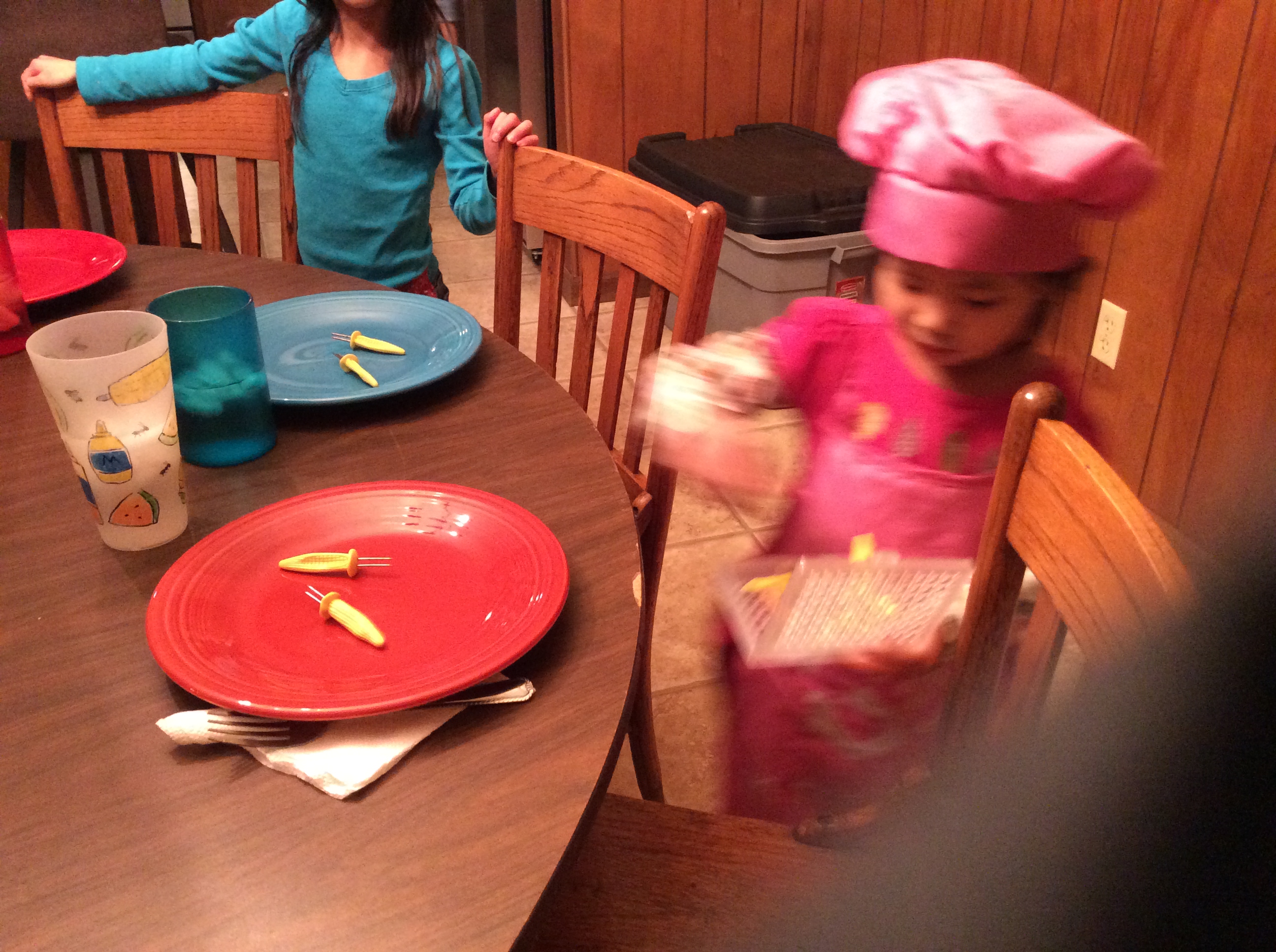 Dishes being set by 4-year-old Li’l Bit, who is an excellent kitchen helper.