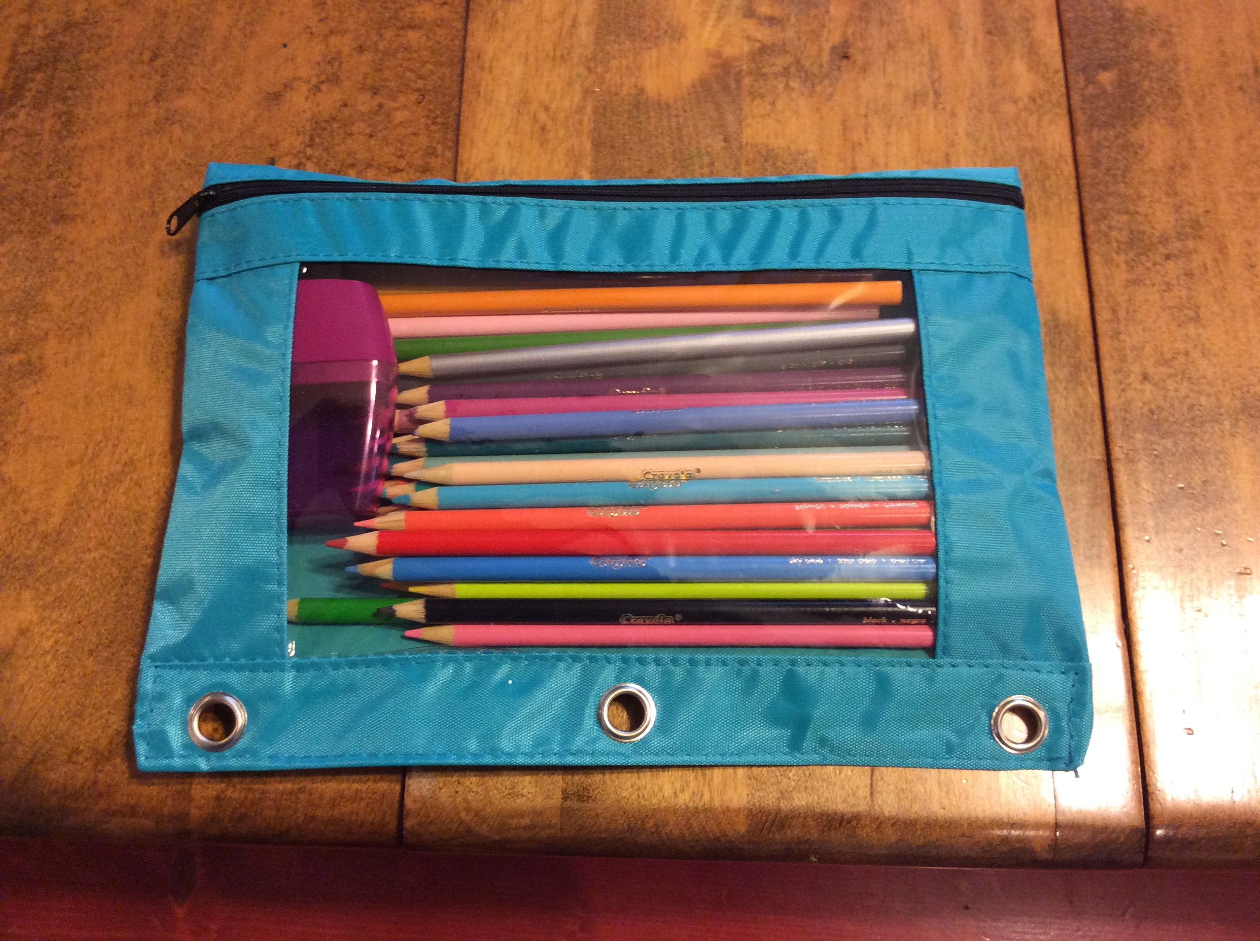 A $1 pencil pouch of goodness. One full set of newly-sharpened colored pencils AND a sharpener ready for on-the-go learning!