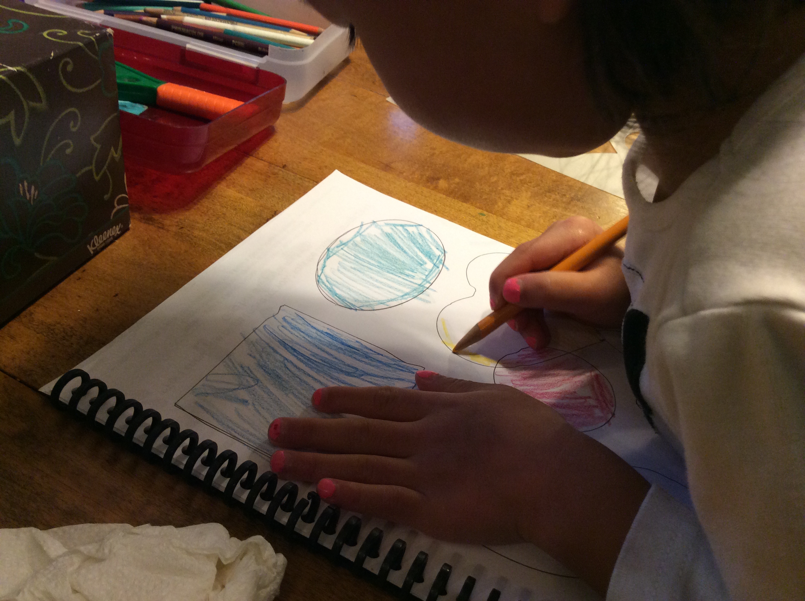 4-year-old working on shape page. She traced them herself with templates and then colored them in too.