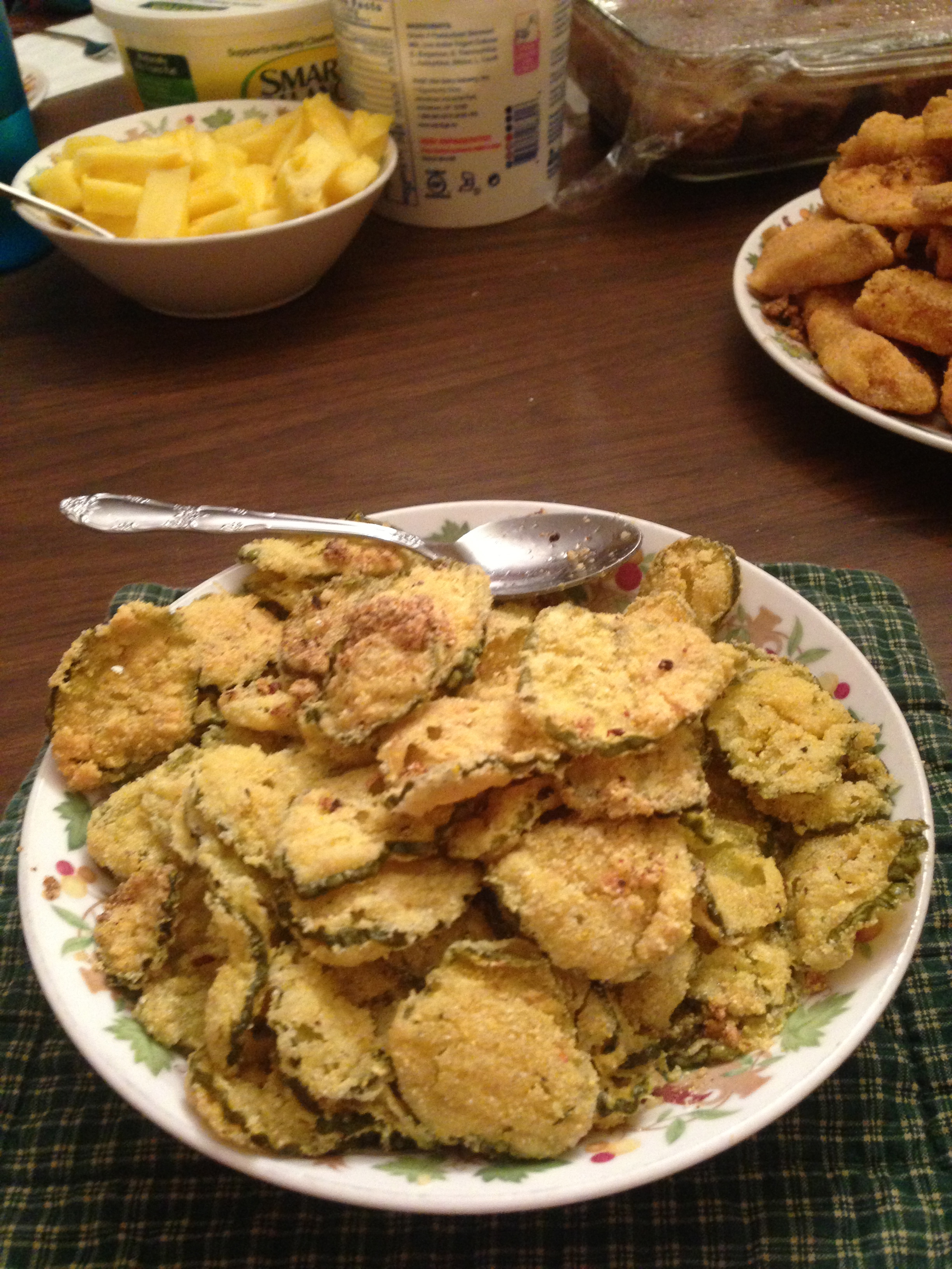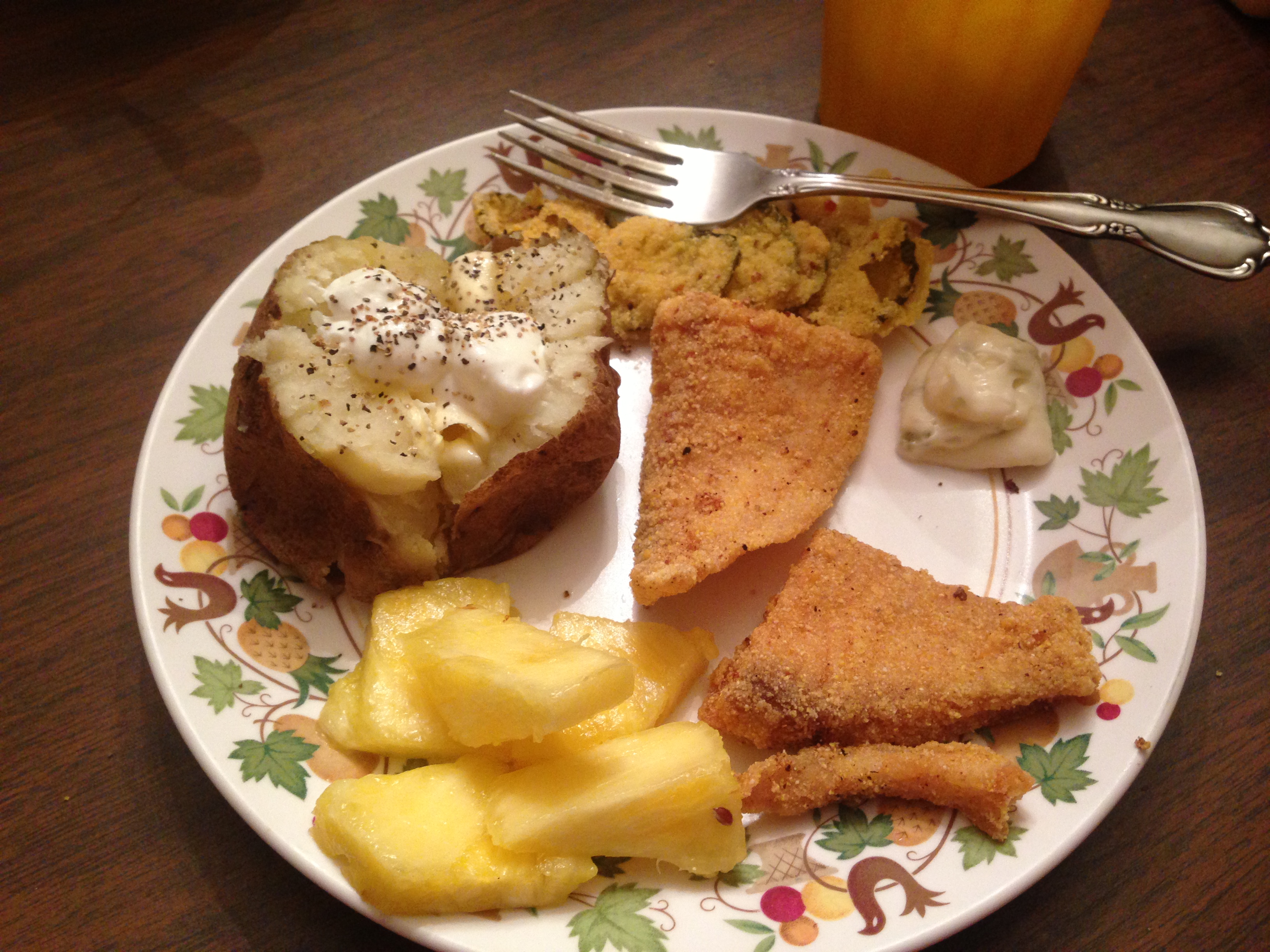 The best-ever pan-fried tilapia, fried dill pickles, fresh pineapple and baked potatoes, all prepared by our 15-year-old son. He is cooking dinner most every Monday night, which includes fresh fish prepared by the chef’s choice.