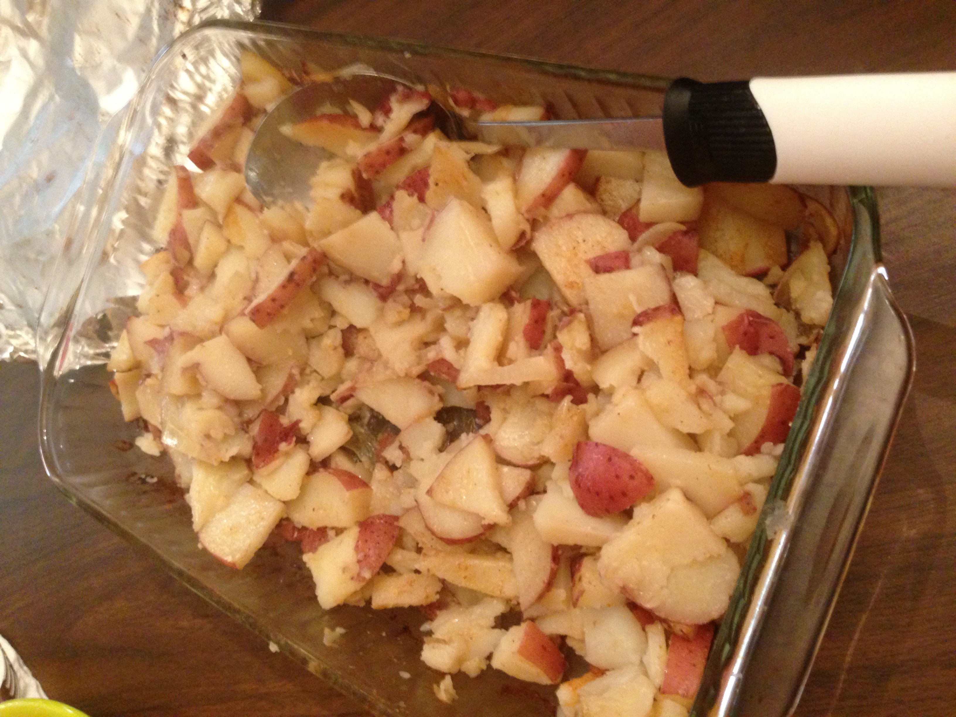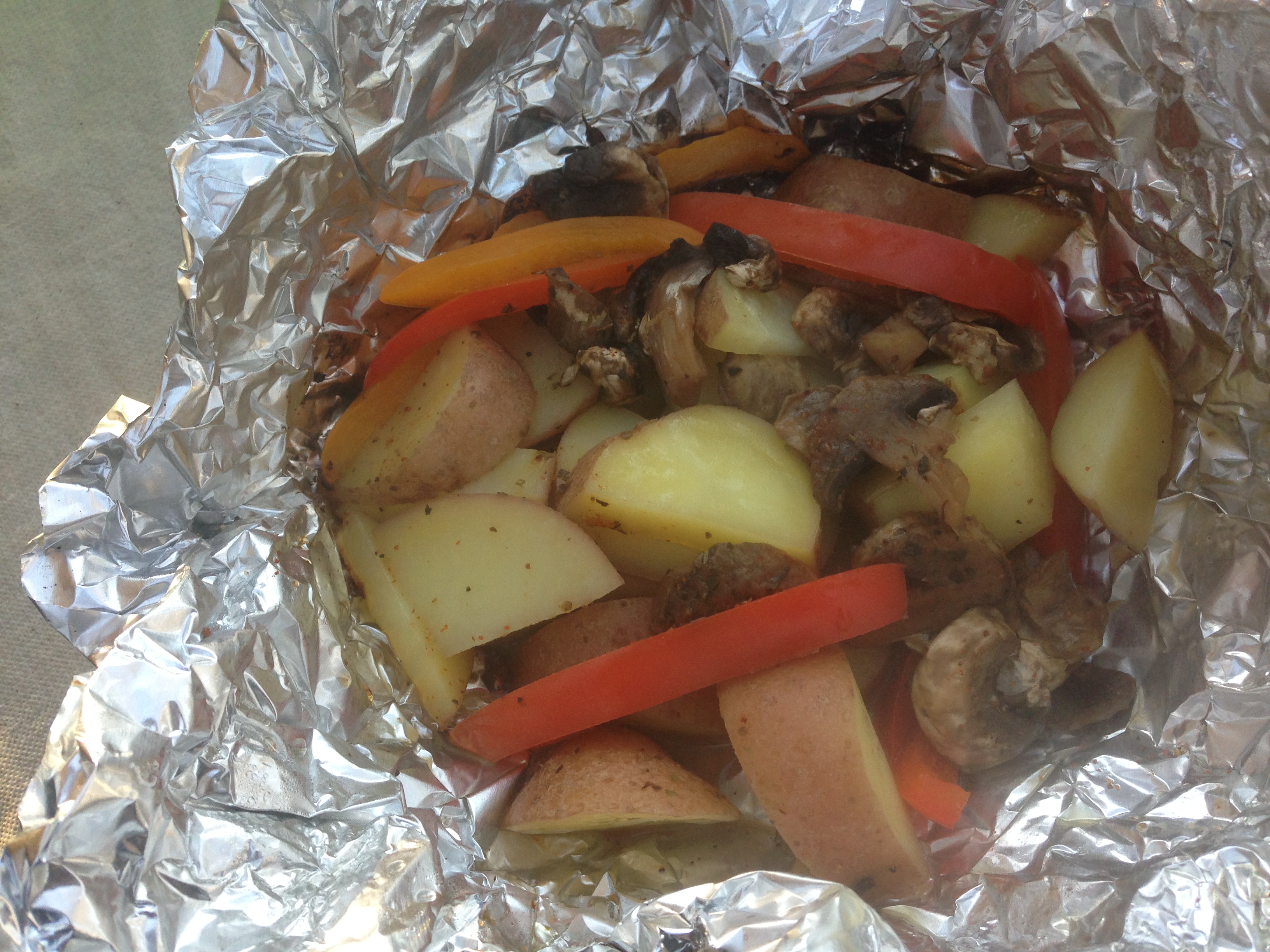 A foil packet with potatoes, peppers, onion, mushrooms and spices cooked to perfection on the open fire at our campsite on a recent trip!